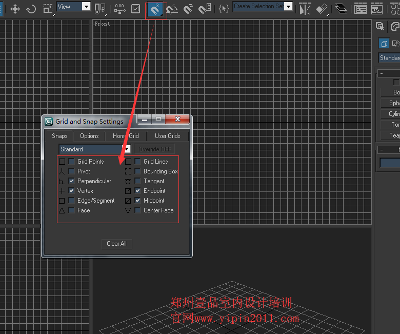 说完了正确使用捕捉工具的方法后再来讲解一下捕捉点的设置。把鼠标放置在捕捉工具上面右键单击就会出现下图所示的选项框,这里面默认的勾选选项是栅格点,我们需要重新的设置一下来符合我们室内设计制图方面的要求。图中左侧选项的名称分别是“栅格点”“轴心”“垂足”“顶点”“边/线段”“面”,右侧选项的名称分别是“栅格线”“边界框”“切点”“端点”“中点”“中心面”,我们需要选择的选项分别是“垂足、顶点、端点、中点”,记住千万不能全选,全选这些选项的话基本上捕捉工具在捕捉的使用中不能起到精准捕捉的作用了,通常我们室内设计专业用这四个选项就足够达到捕捉工具的使用目的了,如果特殊情况下需要其他捕捉选项我们可以根据实际情况适当勾选。