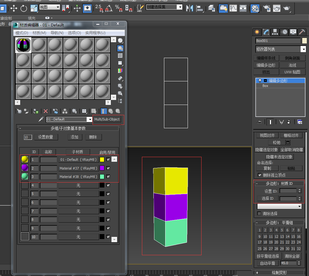 下一步,点击修改命令下拉菜单,激活编辑多边形命令,然后选择多边形,框选长方体的第一部分后,在设置ID框里面输入ID号1,然后单击选择ID按钮,第一部分就会变成如图所示的黄色状态;然后框选长方体的第二部分,继续在设置ID框里面输入ID号2,然后单击选择ID按钮,第二部分就会变成如图紫色状态,那么以此类推编辑完ID3即可。