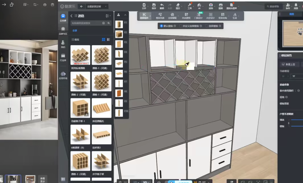 然后我们把下面这个柜体给它制作一下啊,下方这个柜体的话我们需要给到一个竖版中竖板先放中间一分为二啊,这里会自动吸附中线中枢吧。给完以后呢这是两扇柜门,这是一扇啊。再次添加一个中枢版这种吧是我们下方柜体的一个中枢板。比完之后我们把柜门添加一下。首先是左侧这个柜门,三个抽屉门,选择柜门儿放上之后呢,修改一下眼纹类型内嵌,接着给它进行一个切分,上下切分,切分扇33份等分确定。分完之后它有拉手的,双击一单双击单独选这么一个柜门。我们在风格替换里面添加把手,选择把手,改变把手的一个位置,居中,旋转角度零度,然后再改一下它这个柜门的材质白好,第一个已经完成,下面我们用N样式刷把它刷给其他的柜门,这是我们左侧区域,然后中间选中放置,修改掩门的一个类型,内嵌左右切分,切分成两份儿确定我们在此单独选中单个柜门,再去放置它的这个拉手风格,替换里面添加把手。在酷家乐做效果图时,同样选择极简拉手,然后改变它的位置,右上改为右中,这是左侧的,右侧同理双击再次添加把手。再次改变它的一个位置,它应该属于左中。改完之后呢,我们可以通过M材质刷把这个柜门的一个颜色刷给它右边再次给一个啊选择无拉手门好放置改参数,改它的一个衍门类型,内嵌。接着N材质刷吸附刷,右边跟左侧一样,没钱切分,上下切分三确定切分完之后呢,按样式刷把材质和这个拉手同样给它刷上来。嗯,接下来的话是中间部分啊,左侧吧左侧开放格均分成三等份了,我们再次选择层板任意放置,接着呢板间均布上下均布两个,确定这样就等分成了三等份。上面这一部分同样是左侧、右侧和中间,再次添加我们的中竖版,添加一个,改变一下它的一个数据400,再添加一个中枢版放置继续修改数据,里边一样也是400啊。双击它单独选中,输入400敲回车,那么里面还有一个横向板件,添加横向板件,也就是层板啊,中线再选择一个层板,同样是中线。最后的话还差一个是我们的一个内嵌柜和一个酒嗝,咱们先用一个层板把它一分为二,分开分开之后下面是九格,上方的话是这个套板,需要我们再次进入我们的一个组件库啊,产品库组件库。进入组件库找到空间组合,空间组合里面有收纳柜,我们选中一个内嵌柜,选择放置就可以了。还有一个就是我们的九格选择,可调九格选中它会自动吸附改变大小啊,放置结束。最后的话是我们上方的这个内嵌柜,里面依然是有这个竖版的选择。我们的中竖板左右进行钣件均布啊,左右的话是两个确定,这样的话就等分成了三份。最后是颜色的问题,颜色我们去刷的时候呢,先改变整体的一个柜体吧,选中整个柜体风格替换,下面呢选择柜体的材质,切换成一个黑色灰色的啊。是棉朝阳。好,这是灰。现在还差一个内嵌柜的颜色是白色的,我们需要用材质刷给它刷过来。但是材质刷刷的时候需要先切换一下组件模式,单个板件单个的去刷M吸取。上左还有下,还有右边,那这个柜体我们现在已经完成了,最后再去添加一些什么装饰品。装饰品的话提前收藏好的,我的里面饰品我们可以摆放一些酒瓶。它也会有这个自动吸附功能啊,选择放置,包括一些书架、书籍。右侧大概添加一下就可以了啊,不用说每一个空间都给它添加上,大概去添加一下复制再选择再次选择放置就可以了。酒瓶好,那么我们一个酒柜模型啊在酷家乐里面就是这样去完成的这它一个操作方法。