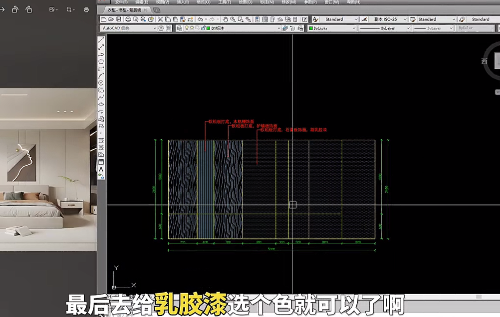 接下来底部它有一个分割缝,从地面往上偏移,大概给到600左右吧。最右侧这一块是整版,所以TR调空格剪切整体的轮廓。做完之后下一步进行一个填充。首先是左侧的木饰面板当选举行,然后选择对象我们选择目视面木质面纹理确定CO复制。正中间的话是格栅板框架轮廓H选择对象。格栅的话我们用ANSSR确定角度改为45度比例的话5单击设置新原点左下角吧确定好,我们左侧的填充就已经做完了,右侧整个的话就按石膏板吧,石膏板勾缝造型,那我们把它也填充一下啊。选择对象框选,我们选择一个预预定义里面查找一个DOTS,确定角度为零,比例大概为50。单击设置新原点,右下角儿预览一下,稍微有点太细啊,比例在30%或者是20都可以。整体的话这个背景墙的结构划分,还有我们填充图案就完成了。下面我们进行一个尺寸标注,左侧上下分割的板件1.8米六百,接着是我们的总高2.4米。左侧选中MI拾取中心点进行到右侧,接着是横向尺寸板件的宽度700的连续标注DCO400、七百、八百、300 500、800 800。最后把整个背景墙的总宽再表现一下,整体的话是5米宽。我们是根据这个造型啊就是效果图表现,然后确定它的一个总宽。最后的话我们把这个材料文字说明给标注一下,在这里一共就这三种材质。第一种的话是我们左侧的这个木格栅,木格栅饰面前提是欧松板打底木格衫市面,接着是我们的欧松板打底护墙板饰面,右边的话呢可以是欧松板打底石膏板饰面,最后去给乳胶漆选个色就可以了啊。床头背景墙完成。