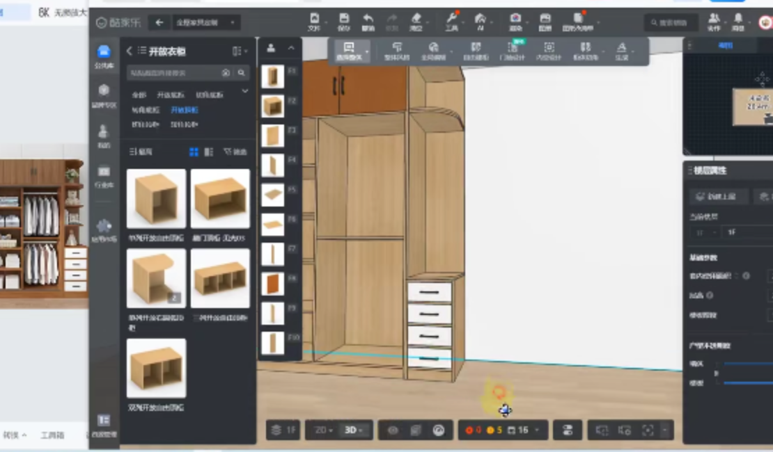 首先进入我们的全屋家具定制板块,alt加5快捷键啊,进入到了全屋家具定制板块。进入板块以后呢,首先柜体我们用一个万能柜,选择万能柜拖入场景,接着改变一下它的一个大小参数,宽度给到2.4米,深度衣柜到600,高度2.2米。接着咱们去创建它里边的这些竖板和横向板件添加数版中数板。酷家乐软件和3dmax软件对比后,钣件均布填充个数的话是两个左右方向确定,均分成了三等份儿。左侧的话分成长衣区和这个叠放区,也叫被褥区。那我们添加一个横向板件,层板选择横板放入柜体改变高度450上下区域分割开来。然后是右侧再次选择我们的层板,捕捉到我们的中线上下一样两个短一区,就在正中间的话呢是一个均分,同样是选择层板任意放置,再进行一个钣金军布上下均布,上下均布的话填充个数为四个,这个是均分成5份儿。确定好柜体的结构,大概是这个样子的啊。然后里边的话有一些衣杆,我们后期再来添加。接着我们说上方的吊柜。